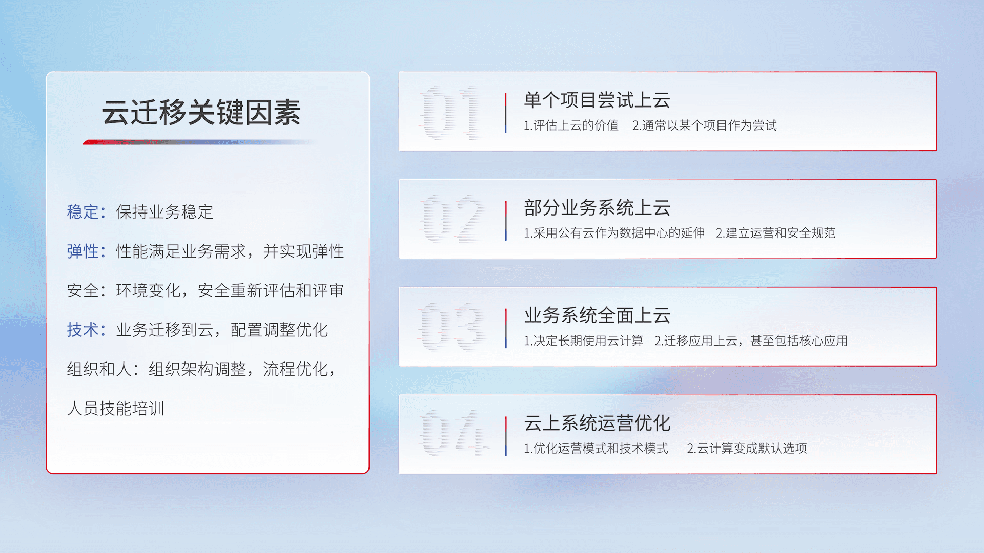 结合实际业务,,,,从规划设计、、、、云平台选型、、、、云原生改造、、、数据迁移、、集成交付,,,迁移全过程为客户识别最佳上云路径,,做好风险识别管理,,设计网络架构、、、、身份权限、、安全审计合规、、操作审计、、、、日志审计、、监控告警策略、、、、多站点容灾设计等,,,,对云上基础设施进行整体规划,,,提升IT治理水平,,以满足弹性、、、、高可用、、高性能的需求。。