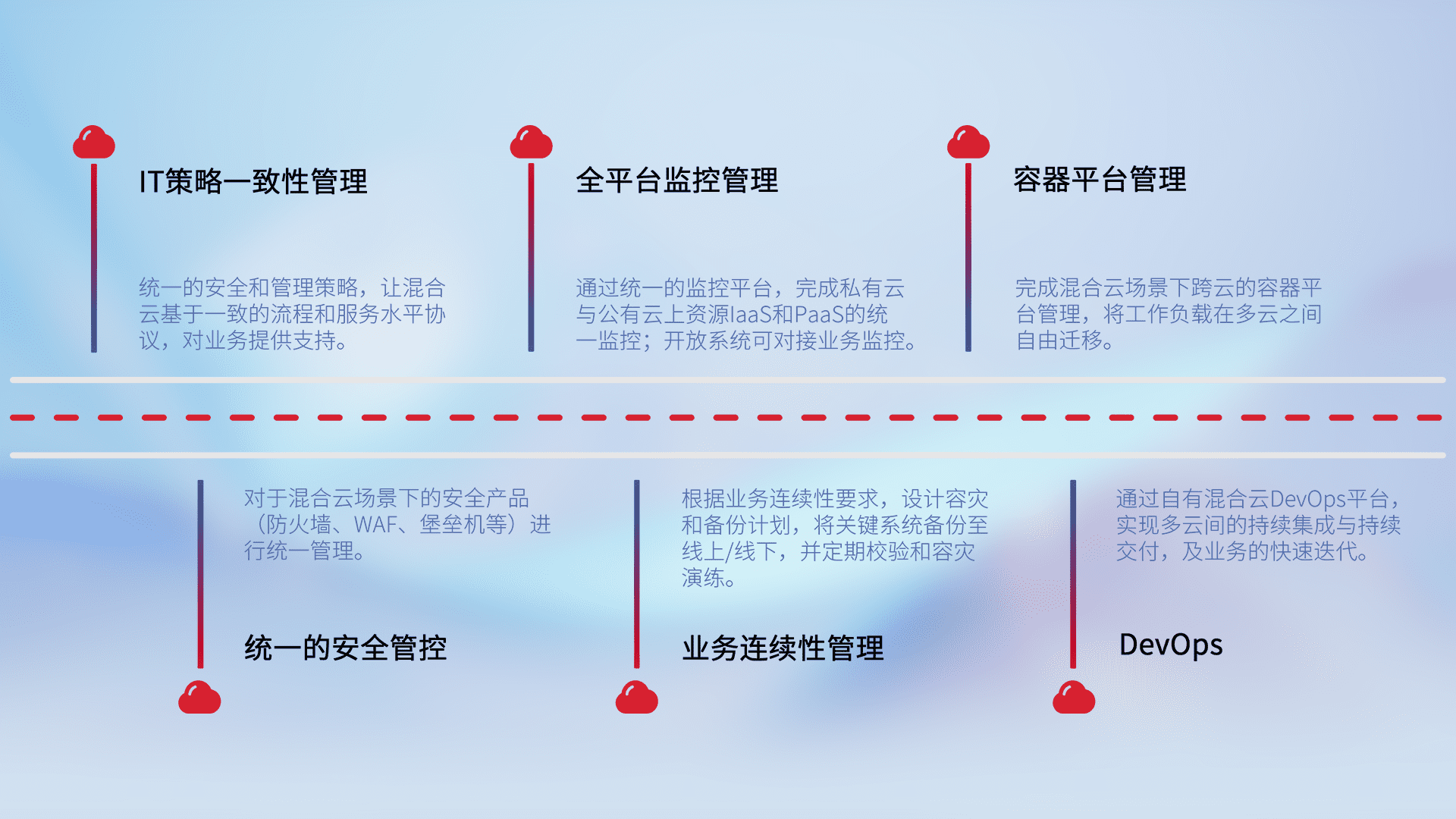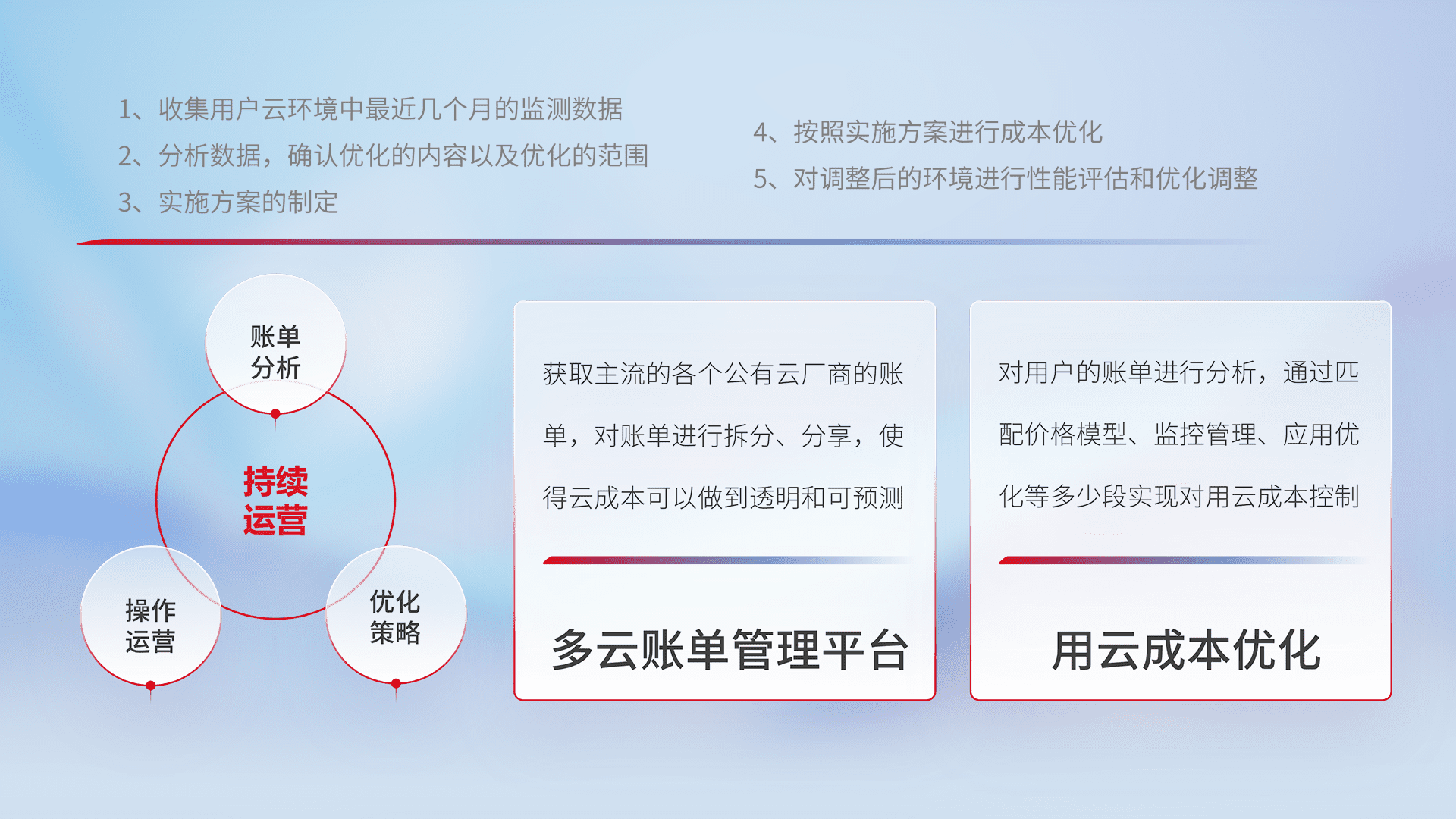 通过多云纳管,,,,以统一的资源数据模型把客户的云资源进行抽象和封装,,进而实现对多云资源的统一操作,,保障云资源管理的可靠性、、稳定性与可用性。。。量身定制化运维内容,,,配置、、开发运维、、补丁管理、、备份、、监控、、、、认证和访问管理、、、、审计和日常巡检等,,,保障在用云过程中的可靠度,,,,稳定度以及高可用率。。。