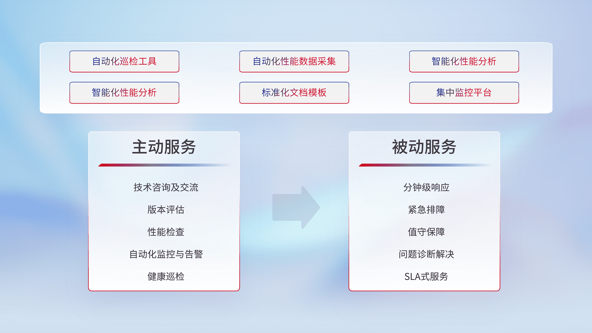 智能化工具和标准化文档,,保障服务质量,,,提供主动服务(包含技术咨询、、、版本评估、、、、性能检查、、自动化监控与告警、、健康巡检)和被动服务包含(分钟级响应、、紧急排障、、、值守保障、、问题诊断解决、、、SLA服务)。。。
